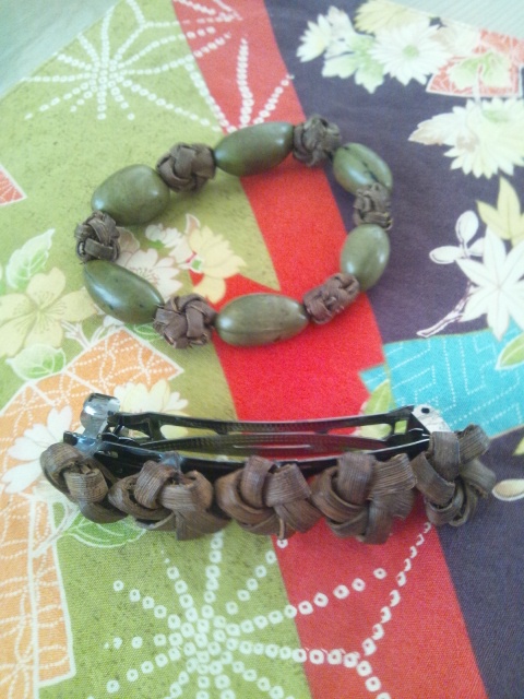 バレッタは、前に作った花結びの5連を髪飾りに