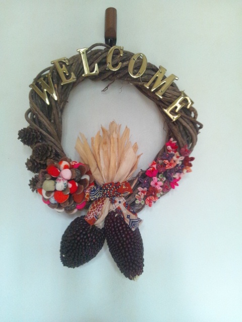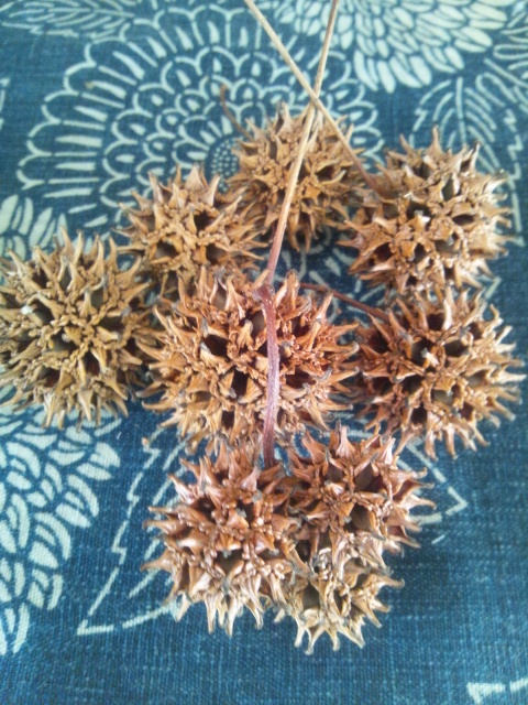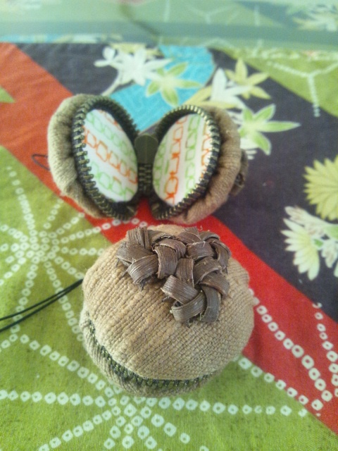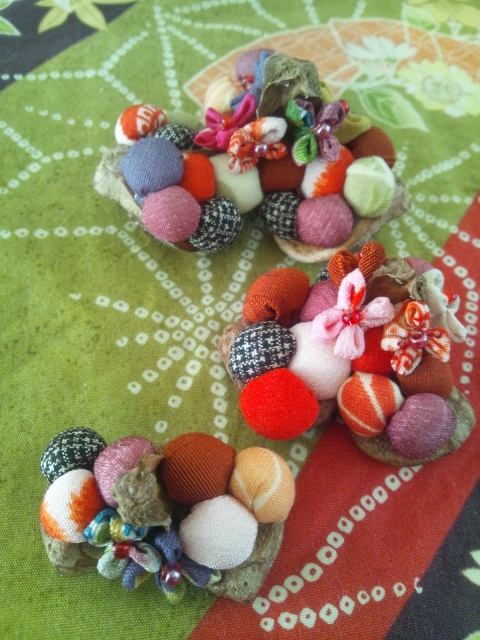 大きな松ぼっくりには布の玉を入れて、色あせた
