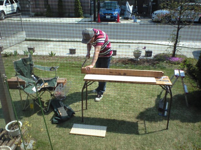 現在は、のこぎりで木材をギコギコと。